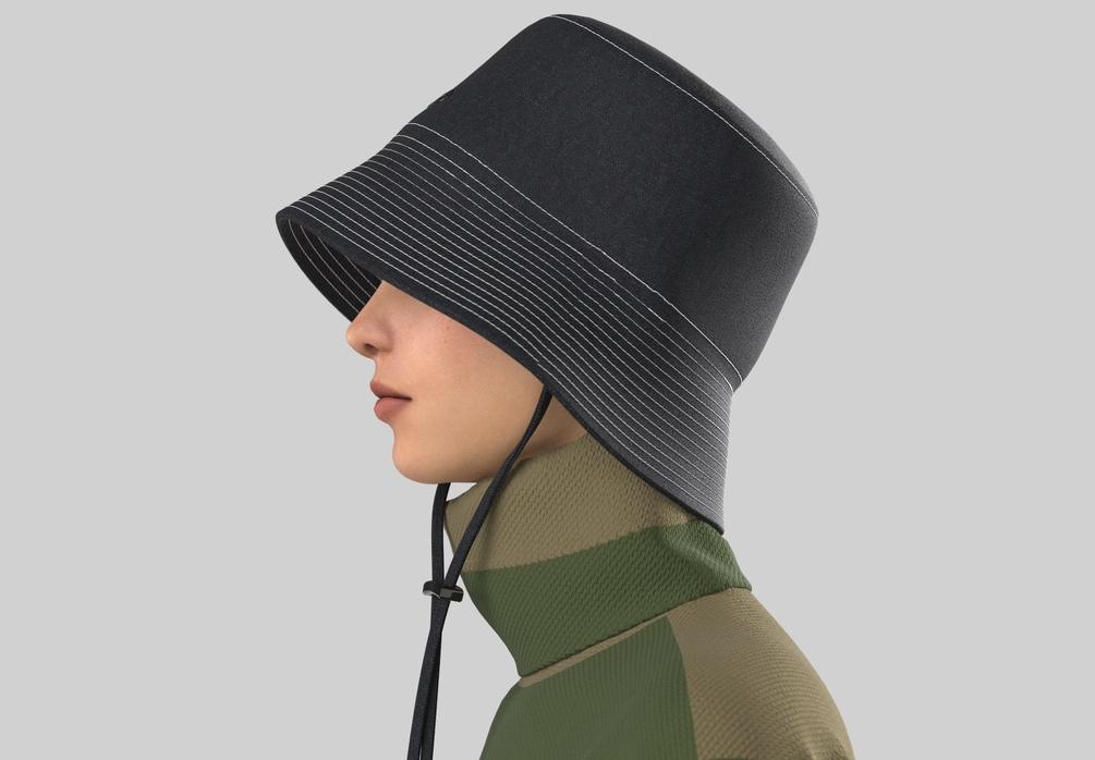 Denim bucket with contrasting rolls of top stitching and strings details.
